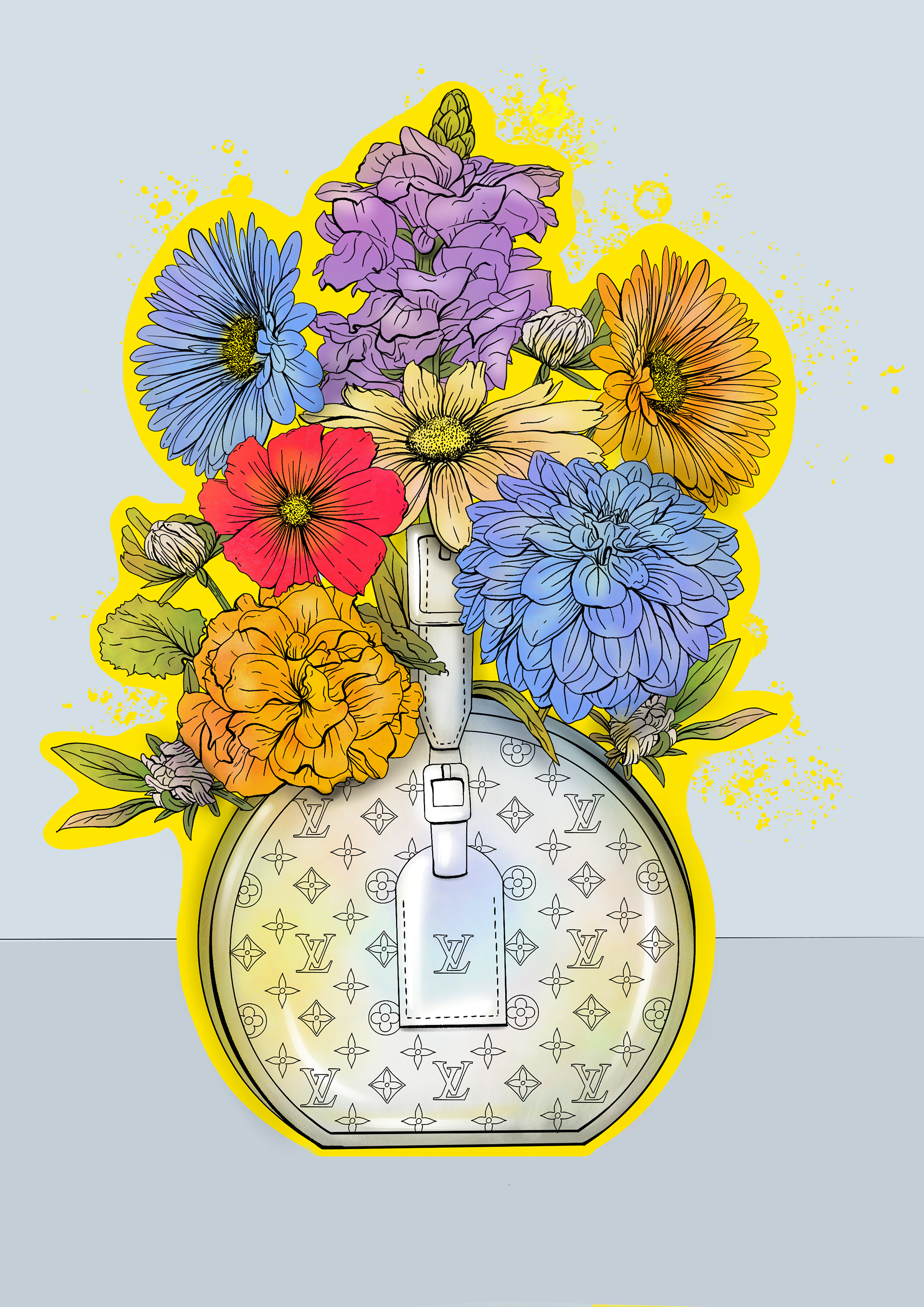 For the first illustration, I explored Louis Vuitton’s porcelain pieces, selecting a vase inspired by the shape of the Boîte Chapeau bag. Infused with my passion for botanical art, I combined this home decor piece with flowers from a bouquet I had at home, creating a rich, organic composition in two contrasting colour palettes.